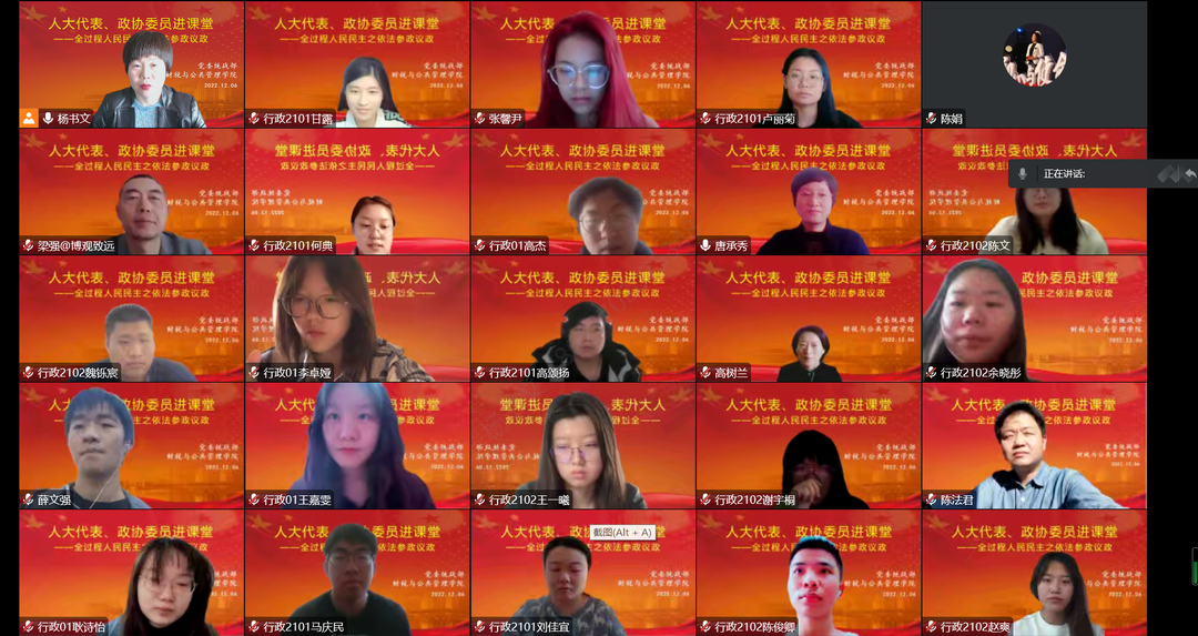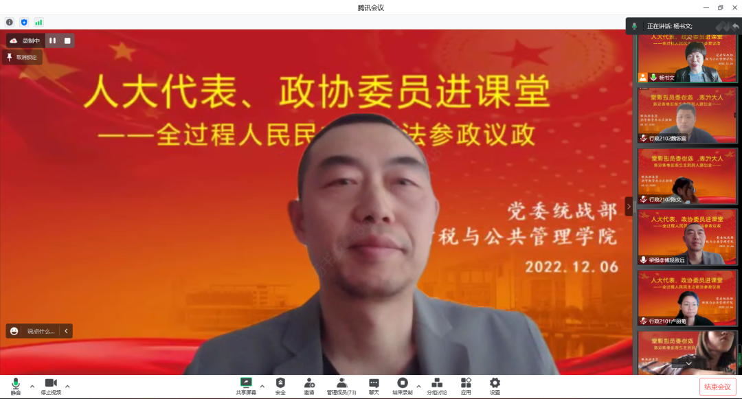 我校把全面深入学习宣传贯彻党的二十大精神与课程思政改革深度融合,不断推出新举措。在校党委统战部与财税与公共管理学院党委共同推动下,《行政管理学》课程主讲教师杨书文教授邀请到了三位人大代表和政协委员走进课堂,与同学们开展了一场别开生面的教学活动。