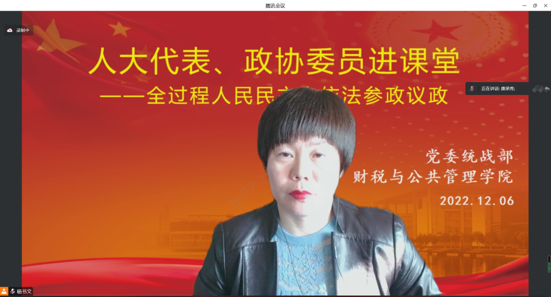 市人大代表、民革天津市第十三届委员会委员、财大留学人员联谊会会长、理工学院院长、图书馆馆长唐承秀研究馆员,以“学习贯彻党的二十大精神,在新征程上履职尽责践行全过程人民民主”为题,围绕党的二十大报告中有关全过程人民民主的内容,介绍了如何更好地发挥人民代表大会制度作为实现全过程人民民主重要制度载体的作用,切实保障人民群众的知情权、参与权、表达权、监督权。结合作为市级人大代表的履职实践,她向同学们介绍了在行使知情权、参与权、表达权、监督权过程中所参与的主要工作,并结合多年参政议政的经验和事例,向同学们讲述了如何进行咨政建议选题、如何开展调研及如何撰写高质量的咨政建议。