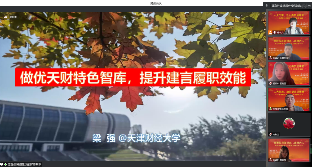 河西区政协委员、财大党外知识分子联谊会副会长、商学院市场营销系梁强教授,以“做优天财特色智库,提升建言履职效能”为题,介绍了自己学术研究与参政议政一体化发展的经历与成就,他指出,无论是政协委员还是大学生都要有政治担当,建改革之言,献发展之策,谋务实之举,办利民之事;要以需求为导向,要有问题意识,切实做到谋在新处,干在实处,发挥自身优势促进社会发展。